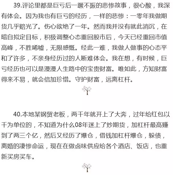 21.单位一位退休老领导最高四百万,最后配资1500万,原计划赚到一千万收手,结果股灾1.0爆仓。一位同学中学老师,150万本金,融资经历股灾1.0'2.0以后爆仓。另外一位朋友逃过前面两个股灾,却在股灾3.0爆仓。股市的风险必须时刻记心头,轻易不要融资,配资更不可取。