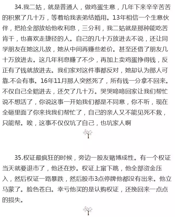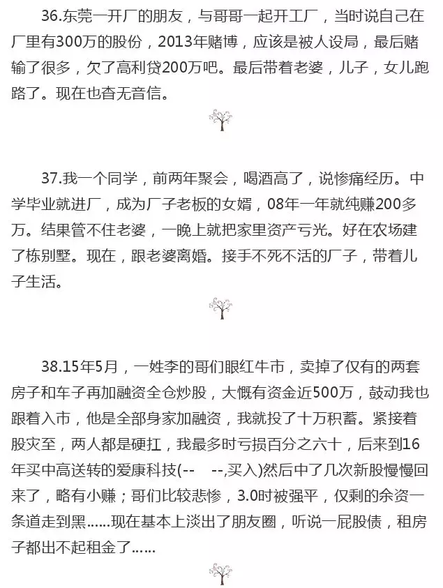 13.住在我家楼下的邻居,男主人常年在家炒股,而且前些年确实赚了一些钱,房子都是炒股赚的钱买的。2015年自觉在股市的操作水平已经很牛,将房产抵押全数投到股市,恰好遇到崩盘,几夕之间输个精光;后来闹得很大,有黑社会样子的人上门来收房,女主人还是中学教师,也闹到了她所在学校,再后来就再也没见到这家人了