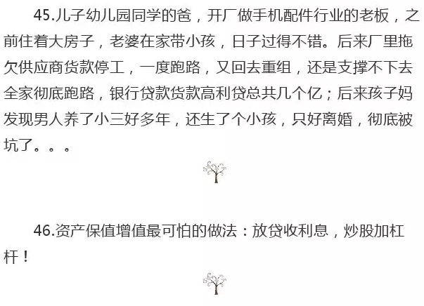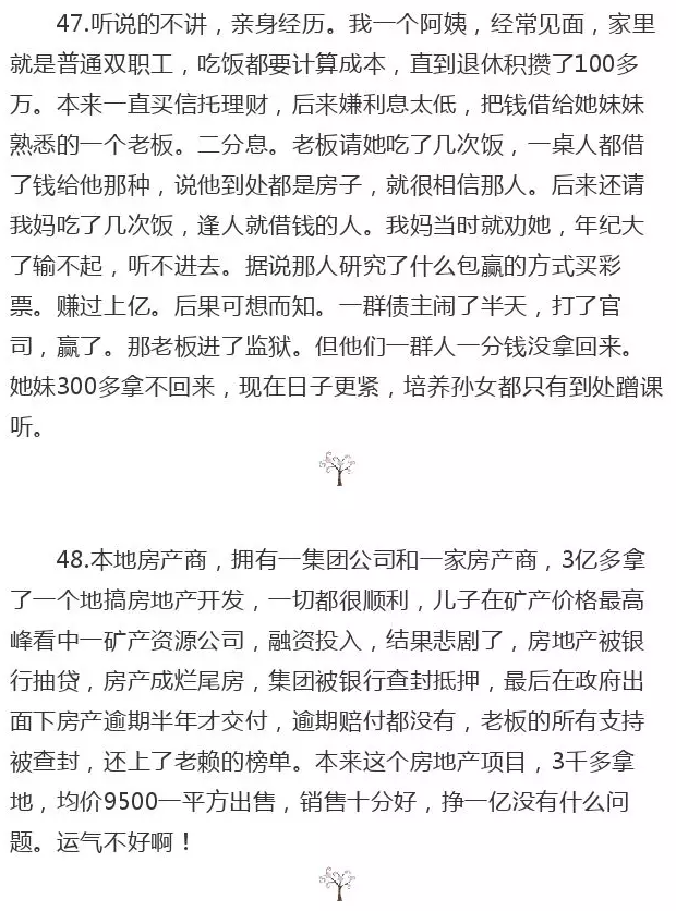52.浙江有一位房地产的前辈,在那边也算知名人士了。八十年代就做房地产了。他是一个传奇!文化水平不高,小学。从做泥工开始。做到几十亿。往年每年过年都见面的。一家人和和气气。在当地名声也很不错。因为,他盖房子,是有良心的,用工用料都实在。自己就住在自己盖的小区里,办公室也在自己盖的小区里。每次去看,那办公室都安安静静,里面的员工都是动辄十几年几十年跟随他的。为人真是不错!结果,前些年,经营方面出了问题。因为他借了很多民间借贷,我知道的一笔就是,找浙江一家非常有名的上市公司周转了大约五千万,利息一年一年五百万左右,借一年。结果,后来回款了,想提前换,人家不让,非得全额算利息。为什么他会这样呢?因为,他不太管具体经营,可能本身也不太精通,加上人很实在,所以,周边很多打他主意的人。这个弄一点那个弄一点,像一艘船,破了很多小洞。各种奇闻,都是他那里得知的。有旗下老伙计,承包钢材木材的,卖给他,一车拖进工地,然后转一圈,拖出来,再转回去,又算一车的钱。可是,早些年,利润高,这些小钱,根本不算什么,也就算了,都是老伙计了~大约前几年的时候,市场不好了,加上,屋漏偏逢连夜雨,几块地由于拆迁,领导换届等问题,拖进去了。这下子,就倒霉了!话说,由俭入奢易,由奢入俭难。这一下,摧枯拉朽,处处碰壁。就去民间贷款,银行贷款。最后绷不住了。要知道,有些钱,放贷给你的人,你是不得不还的!一旦出了问题,变卖各种资产,先把这些不得不还的大爷的钱还了,才有机会往后走。好了,拆东墙补西墙,这样搞了一阵子,还是绷不住。我那时候看他,真是感叹,他很早就开奔驰600了,老款的,巨大无比,然后,他身高不高,从车里下来,再加上比较憔悴,真是看上去难过…再后来,被以非法集资抓进去了。至今关了好几年了,听说可能快出来了。这几年,年年都和家人在监狱过年,他儿子也被抓进去了,当时在另一个城市被手机定位,一下子就抓到了,飞快的!这我党要抓人啊,哪里跑都跑不脱。最后清算,我都傻了,创业三十多年,最后倒欠国家几十亿。我都不知道怎么算的!当时想引入新房产公司收购或者入股啥的,都到这一步了,谁还雪中送炭?都跟秃鹫一样等着,那是世态炎凉!由于他整个发展历程,这几年我都多有耳闻,我前些年还专门请我的伙伴们去了浙江,专门在他工地待了好久,开会,检讨,那一片别墅,真是好位置好房子,可是,无人开工,落寞异常,我们待在那里,就感叹!真是要保守!保守一点,方能去求长治久安!你钱多,身边很多人可能就冲着你的钱来,你权利大,那么,就冲着你的权利来!经营一个事业,随时要想到万一发生最坏的情况,我该如何面对,应对!投资理财,随时要想到,万一再有股灾出现,我该如何处理!我想,我可能这辈子都不会去尝试满仓了,更不用说融资融券那种杠杆了。这位前辈带给我的冲击太大了。后来我写了一些文章,也是从这里面感悟到的。事业做得再大,倘若没有腾挪的空间,没有弹性的策略,只要一次,只要一次突发状况,很可能就要收走你之前累积的所有!后来,我对欧文卡恩那句话,有了很深刻的体会——格雷厄姆教给我最大的一点就是抵御赚取快钱的诱惑!以及,巴菲特说——人一辈子富一次就好!那真是充满智慧的格言!一辈子富几次,能留下传奇的经历,能留下动人的故事。一辈子富一次,只能留下从容安逸的人生,没有故事,没有传奇!