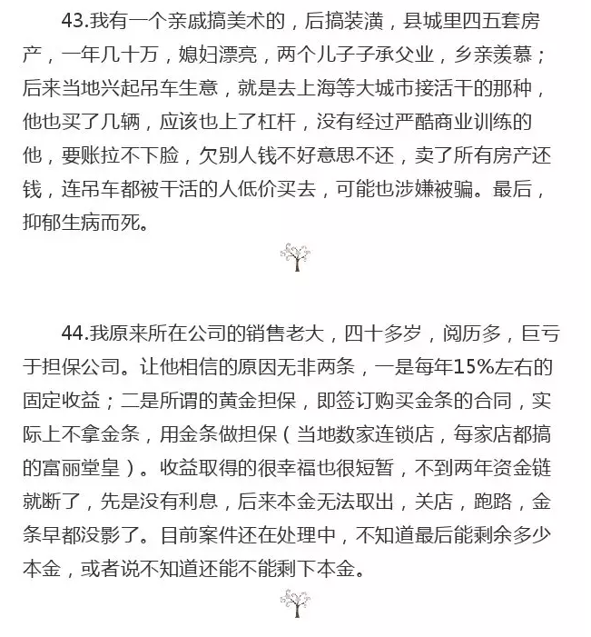 54.一个普通朋友,农村家庭没啥资本,没啥钱,自己心高气傲,上班坐不住也瞧不上,14年跟人学用信用卡套钱出来各种折腾,动员身边亲人全部都办了卡给他,自己老婆,姐姐,姐夫,,,等等,,,一开始蛮顺利,挣点钱天天吃喝玩乐,(其实后来才知道开始也没赚到啥钱,但是套出来贷款手里上百万就是天天玩,还赌钱)后来开始抵押车子房子,又在身边朋友同学借钱,五万十万的借,骗,最后沦落到没钱吃饭两百块也要借。大概一年后,瞒不下去了,跟家人交代一共欠了200万左右吧,中部地区农村家庭这算一笔巨债,各种银行信用卡现金分期,各种小额贷款,网络贷款,车子房子抵押贷款,连她老婆名下也不能幸免,父母家天天被各种银行贷款公司委托的讨债人闹得一塌糊涂,一气之下把他赶出门,媳妇直接诉讼离婚孩子也不要了直接走了,真正的妻离子散,家人不容,有家不能回,凄惨!!!16年5月份后到现在就没消息了,,,,这人是我朋友圈一个最负面的警醒,整个圈子朋友都常谈起以此人为戒,坚决不做超出能力圈的事,不管赚再多钱,再风光,坚决不碰赌,不沾毒品,风光时要给老婆孩子,父母留一个保他们生活的安全垫。