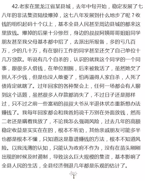 19.哦。去年股灾前,一帮大佬吃饭。个个几亿身家。面色红润!股灾后,好多亿万的灰飞烟灭。最惨的一个剩下最后5000万市值股票。可是自有资金只有2000万。复牌,一字跌停连续。眼看要破产。群里各位大佬们奋力相助。买开了他的跌停。他排在最前面。当日群里没有其他话。都是各种问他成交了多少。他不停的贴还有多少没成交。如果当日他卖不掉。次日完了。负资产。他孩子还小,努力了那么多年的积蓄。那天是我混投资群多年来最感动的一天。投资人天生的是互相拼杀获利的。可那日,大家明摆着亏也认购。也算一个巨亏的故事吧。差点破产。股市风险,慎用杠杆!