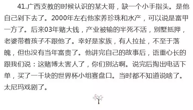 16.吃喝嫖赌毒,都是不太好的,但其中以赌和毒最为伤筋动骨.。2016年初,我两个远亲,都是千万身价的,一个在澳门赌博,一个在网络赌球。下场是一个非法集资,大部分亲戚被拖下水,资产倒贴不够,入狱服刑。另一个稍微好点,从大老板到面包车司机。所以,有时,快就是慢,慢就是快。做人做事到最后,还是靠拼人品。