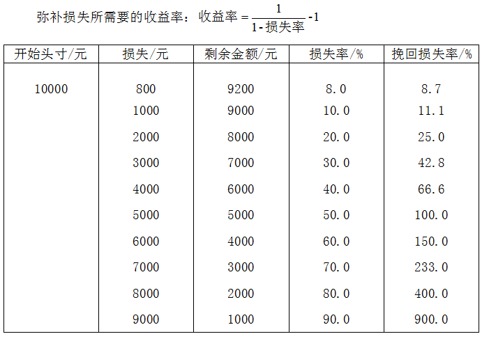 这意味着损失越小,你挽回损失的难度越小,挽回损失的难度随着损失的增加呈加速上扬之势;这也同时说明,无论你以前的交易多么成功,只要你在此后的任何一次交易中遭受重创,那么你在没有追加资金的情况下要弥补亏损,将变得相当困难。所以,在出现风险的时候马上及时处理,不能拖延,投资行业有句话说的好:“不怕错,最怕拖”。赢家之所以是赢家,是因为他们会让钱盈亏有度!这样才能不损害账户本身,不给自己增加难度。