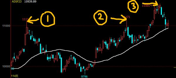 1、2、3这三个反转位置的特征是,反转点的价格和对应均线之间偏离幅度相接近。之所以产生这种现象,是因为均线能够在一定程度上近似反映当前的平均持仓成本。