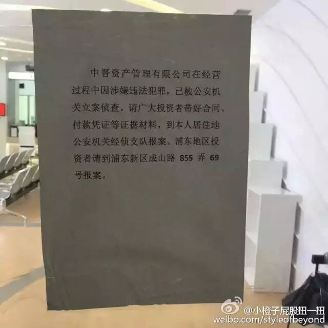 “手里有些钱在做投资,但是慢慢地没法理解这个行业。金鹿财行出问题,还好我没有投资,但是投资的中晋资产管理也被公安机关立案调查,这个就伤透了心。中饭也没心思去吃,一直在问自己:到底什么样的公司才能去投资,银行的产品收益一直不肯照顾我这种屌丝。有建议的高手吗?告示已经贴出来了,被坑的,带上自己的投资合同、付款凭证等材料,到居住地的公安机关经侦支队报案。浦东地区的直接到浦东新区成山路855弄69号报案。”