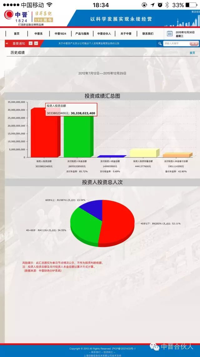 从规模体量来看,中晋是一家百亿级理财平台。据其公布的数据,截至2016年2月10日,中晋合伙人的投资总额已突破340亿元,涉及总人次超过13万,其中60岁以上投资人就超过2万。