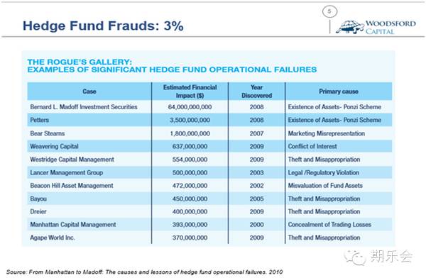 但是在麦道夫之后,还有很多其他基金欺诈案例。根据Hedge event对于全世界对冲基金发生过的欺诈案的汇总分析,他们得出结论大约有3%的对冲基金会发生所谓的Operation Failure,就是欺诈。不要小看这3%,因为一旦你买中了这其中的3%,你的损失很可能就是血本无归。