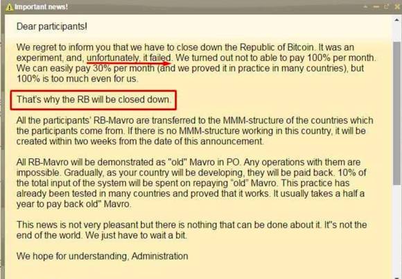 据英国金融时报,MMM行政部门周一(4月11日)正式向投资者发布公告称,将关闭旗下“比特币共和平台”。该平台已经失败,无法做到承诺的每月100%收益率……不过30%收益率不在话下。(依旧钱多哦,人傻速来哦)