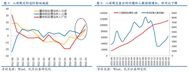 反腐的方向肯定没有变化。要推行依法治国,反腐必然是“开弓没有回头箭”。截至今年5月底,八项规定累计查处116,492人,但是随着大批违法违纪官员的落马,目前增量上有所放缓,今年1-5月累计查处14324人,同比减少7643人。从经济的反应来看,反腐的边际冲击似乎也在减弱。从宏观数据来看,1-5月大额餐饮消费累计增长6.2%,已经走出13-14年的低谷。从微观数据来看,原来受八项规定冲击最严重的星级酒店营业收入已经出现企稳,并不是执行力度减弱,而是经过两年的挤水分,基数已经非常低了。