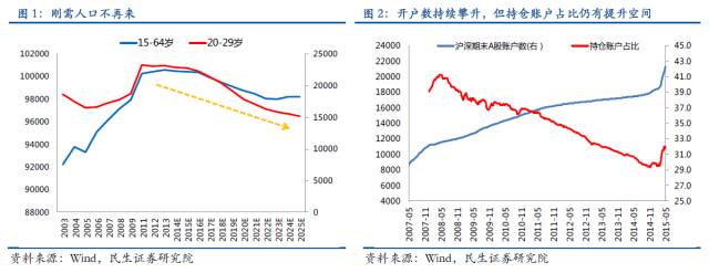 只要房地产是反弹而不是反转,那么未来家庭部门从房地产到金融资产的重配就依然会继续。根据《中国家庭金融调查报告》的统计,中国城市家庭的金融资产占比仅为4.5%,而金融资产又以存款和现金为主,股票占比仅为15%,即便考虑近两年房价上涨放缓、股市大幅上涨的因素,股票在居民总资产中的占比也绝对不到5%,而美国是30%以上。从股票市场的开户数据来看,资产重配也还有很大空间。一方面增量开户数还在持续攀升,另一方面存量账户的持仓占比仅为32%,与2007年的41%相比仍有很大提升空间。