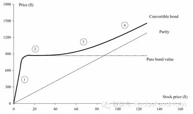 第一阶段,股价很低,发行人的违约风险比较高,如同一个困境债券,价格上涨很快;