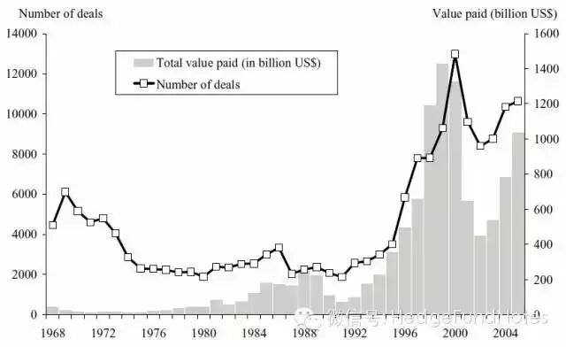 历史上有几次大的并购套利浪潮,每次都非常巧合地发生在股价和市盈率上升的阶段。这几个阶段分别是1895年到1903年的垄断并购;1920年到1929年的寡头并购;1955年到1973年的牛市并购;1974年到1989年的收购浪潮;以及1993年至今,也是历史上最广泛的并购浪潮。