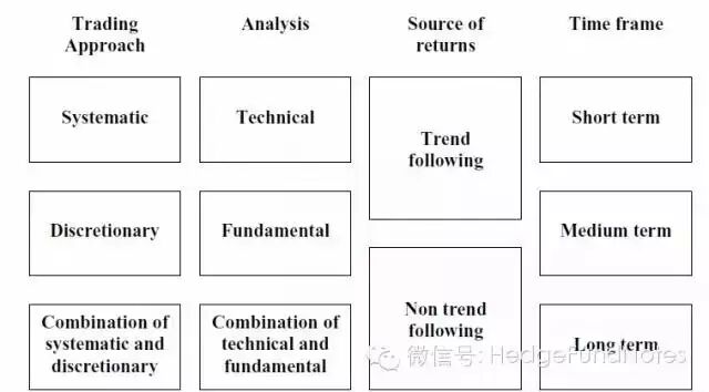 根据交易方法,可以分为主观交易和系统化交易;根据分析方法,可以分为基本面分析和技术面分析;根据收益来源,可以分为趋势追踪和非趋势追踪;根据时间窗,可以分为短期、中期和长期。