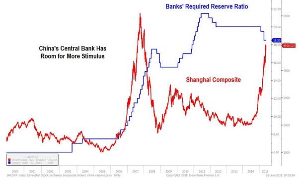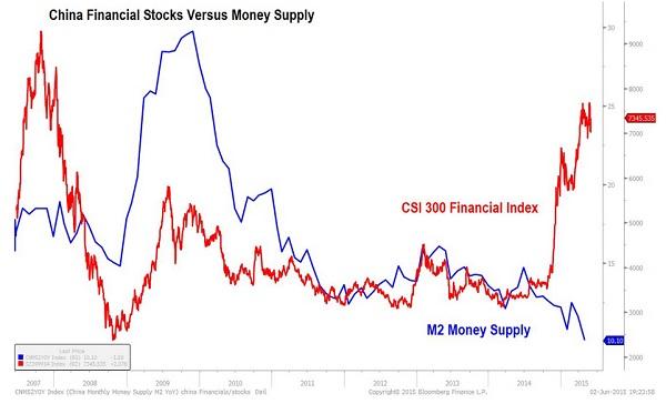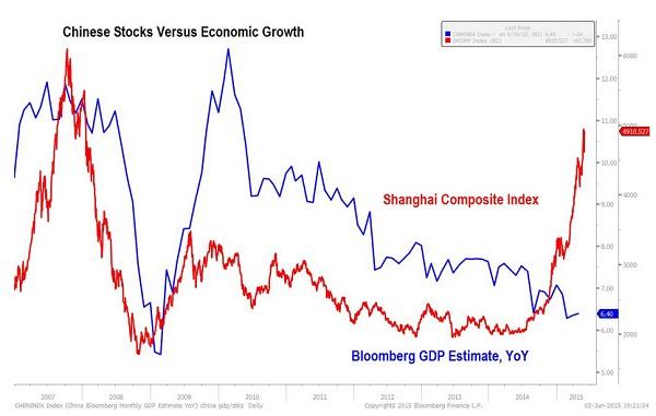 上图是彭博社追踪的中国GDP增速与上证指数的比较。大家别说,07年那个和中国的GDP增速关系还不错,现在有意思了,GDP 一个劲减速,上证指数脱离地心引力。