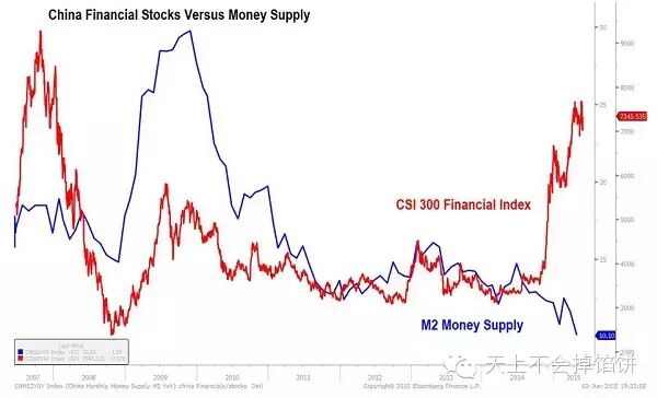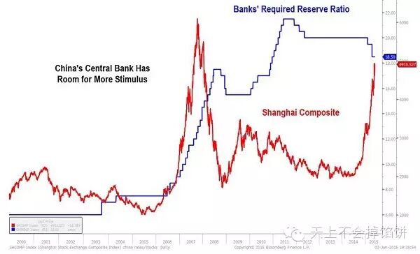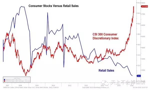 上图是彭博社追踪的中国GDP增速与上证指数的比较。大家别说,07年那个和中国的GDP增速关系还不错,现在有意思了,GDP 一个劲减速,上证指数脱离地心引力。