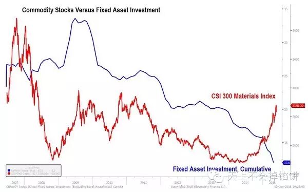 上图蓝色是非常有特色的固定资产投资增速,红色还是沪深300指数。中国经济非常依赖固定资产投资,在自由落体的同时,我们看到沪深300一路高歌猛进。