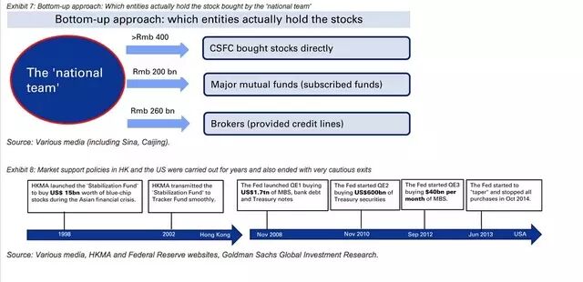 许多客户表达过对国家队退出救市的担忧,我们认为,在市场并未完全稳定以及政府并未表达过对资金的需求的时候,国家队快速退场的可能性很低。另外,此前两个例子也证明政府直接或间接救市的持续时间是比较长的,香港当局在98年金融危机时救市,四年后才逐步退出,美联储在金融危机期间实施量化宽松政策,直到五年后也就是2013年才开始结束QE。