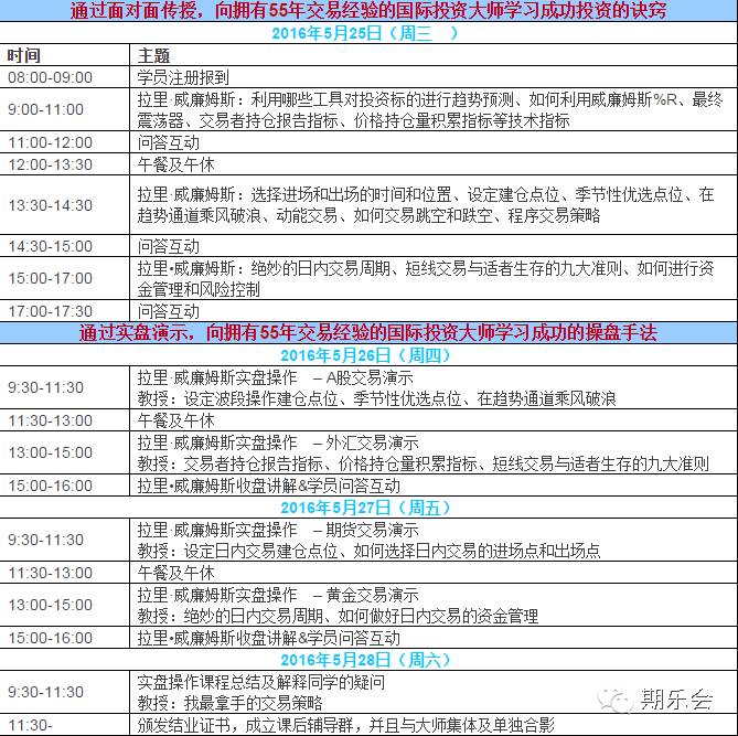 国内威廉姆斯期货大王、短线大师、威廉指标创始人拉里•威廉姆斯将于2016年5月14日至28日来华,倾囊相授55年纵横全球金融市场的操盘经验,以及威廉指标最新用法和他发明的十几个最新指标。你知道一周中哪一天是买入黄金、买入美元指数的最佳时间吗?你知道一周中哪一天是买入或者卖出上证指数的最佳时间吗?