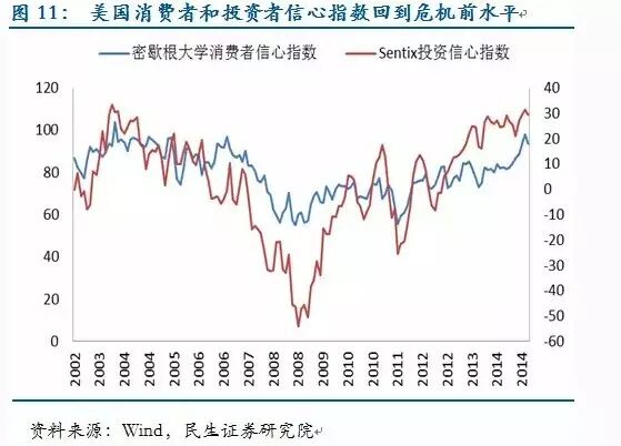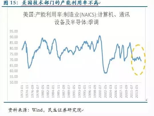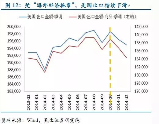 此外,金融危机后美国经济技术式进步的痕迹并不明显。从数据看,美国信息、专业和商业服务增加值占GDP比重没有上升,技术部门的产能利用率也低位徘徊。美国经济复苏更多的还是依赖货币宽松下的财富效应,这两点会成为强势美元重要的阻力。因此美国经济复苏一定意义上属于“存量整合”,而不是“增量创造”,这使得美国经济对海外的依赖程度和对资产价格的敏感性变得更高,复苏的稳健性被削弱。