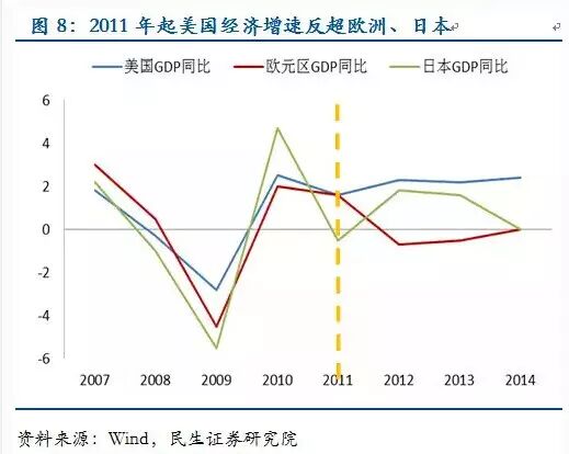 故事从美国经济率先复苏开始,与此同时欧洲、日本、中国都面临着经济失速;经济周期不同导致货币政策背离,市场预期美联储将于今年开启加息进程,而其他经济体则仍在宽松的道路上愈行愈远。美国经济增速自2011年起超过欧元区、日本,但美元升值开始于2014年年中(美联储退出QE)。因此,息差扩大的预期是本轮升值最重要的驱动因素。