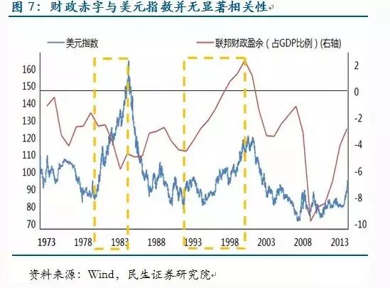 值得注意的是,美元走强与美国财政政策取向并不存在显著的相关关系。80年代的美元牛市伴随着里根政府的扩张性财政政策,以及财政赤字;而90年代的美元牛市则伴随着克林顿政府的紧缩性财政,以及财政盈余。
