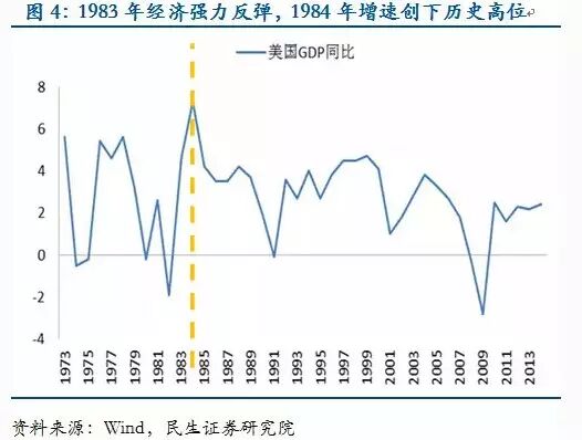 当我们讨论80年代的美元牛市时,不应忘记里根政府的“新自由主义政策”。正是这场“减少政府干预,还市场更多自由”的改革给美国经济仍至整个西方经济注入了新的活力,美国经济于1982年探底后强力反弹,GDP增速于1984年创下7.3%的高位,这恐怕也是支撑美元持续走强的关键因素。