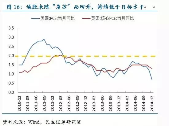 第二,通胀低迷,油价只是助推器,经济冷才是根源。美联储1月会议纪要中已明确指出“通胀”成为影响加息的关键指标。本轮原油熊市开始于2014年年中,而美国PCE和核心PCE自2012年起就持续低于2%的政策目标,一直不温不火,可以证明油价并非低通胀的始作俑者。低通胀始于欧元区的经济低迷。欧洲的通缩通过贸易传向世界,尤其是美国和中国。克服通缩需要提振经济,而为提振经济,各国争相进入宽松大潮。非美货币贬值而美元升值导致美国进口物价被进一步压制,从而继续打压通胀水平。
