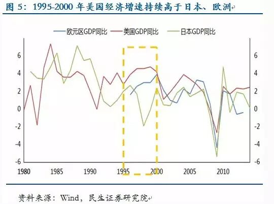 第二是美国经济增长优于其他经济体,较高的投资回报率吸引全球资本流入美国,引发美元升值,1983-1985年、1995-1998年属于这种情况,美国之所以能够多次充当世界经济增长的引擎,表明上看是由于技术的进步,深层看还是得益于其市场化程度更高的经济体制,这种体制更能激发创新,引发技术革命;