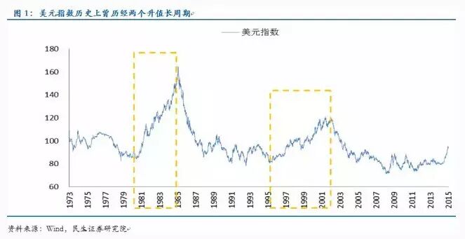 按照时间跨度的不同,美元指数走强的周期可以分为长短两类,短周期仅维持几个季度或者1年时间,而长周期则持续5-7年的时间。比如,1980-1985年、1995-2002年是美元走强的两个长周期(峰值分别达到164.72和121.02),2004年12月-2005年11月、2008年7月-2009年2月、2009年11月-2010年6月则是美元走强的短周期。
