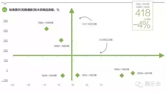 反过来的情况也是成立的,大宗商品的熊市往往对应着股票的大牛市。在1982年至2000年这18年的时间里面,大宗商品价格累计涨幅-4%,而扣除通货膨胀后标准普尔指数累计涨幅超过400%;在1950—1965年里大宗商品累计涨幅16%,标准普尔指数累计涨幅302%。从1929到1949年的20年时间里面,大宗商品累计涨幅是18%,但股票市场的跌幅是-50%,但需要知道,这是在大萧条和第二次世界大战的背景下出现的。