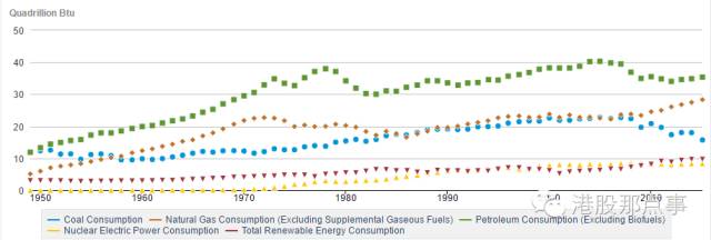 美国煤炭业的产能过剩起源于能源消费结构的内部替代(见下图),这几乎不可逆。2011年至2012年美国页岩气革命的爆发导致天然气的供应陡增,天然气的价格下降了近40%,这促使更多的电力公司转而使用天然气。再加上原油价格的大幅下降,煤炭行业就出现了产能过剩。