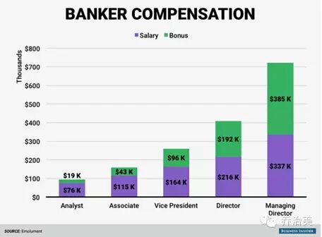 从左至右分别是Analyst(分析师)、Associate(合伙人)、Vice President(副总裁)、Director(部门主管)和Managing Director(执行董事)的工资和奖金(图片来源:Emolument)