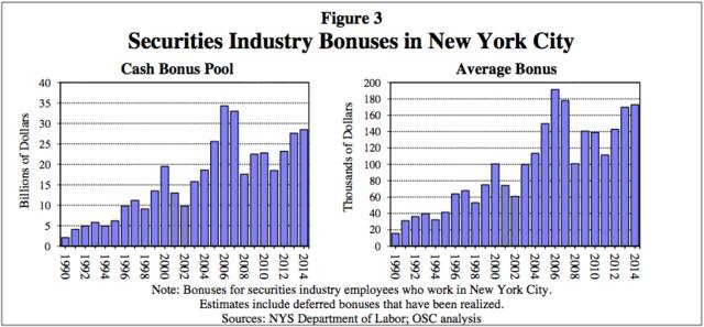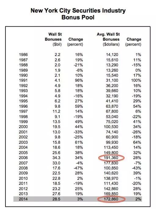就奖金部分来看,华尔街的人均奖金,在过去三年约增长50%,2014年,华尔街人均奖金达到17.29万美元,仅低于金融危机之前2006和2007年的峰值水平。