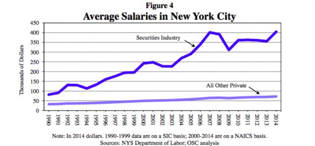 尽管金融从业人员占据纽约私营部门劳动力的不到5%,但其薪酬却占纽约全市所付薪酬的22%。2014年,纽约私营部门的人均年薪为7.23万美元,而华尔街平均年薪约相当于该数字的六倍。2013年,华尔街人均年薪相当于纽约私营部门人均年薪的五倍。