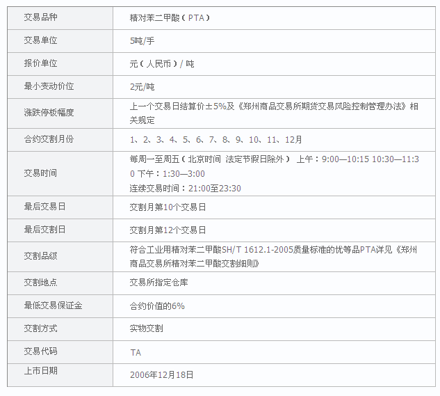 经国务院同意,中国证监会批准,2006年12月18日精对苯二甲酸(简称PTA)期货合约在郑商所上市交易。中国是全球首个上市PTA期货的国家。