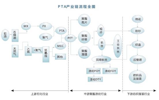 PTA是石油的末端产品,其原料是对二甲苯(简称PX),而PX的原料是石油。PTA是化纤的前端产品,其下游产品主要为涤纶长丝、短纤、切片(包括纤维切片、瓶用切片、薄膜切片)。