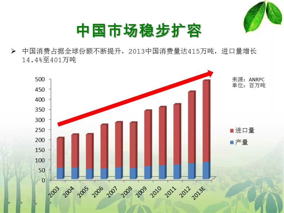 橡胶消费的增长是个长期稳步的过程。在人类没发明新的通用交通工具之前,对汽车依赖度继续。随经济发展,对乳胶制品、其他橡胶制品需求的消耗增长正在加速。