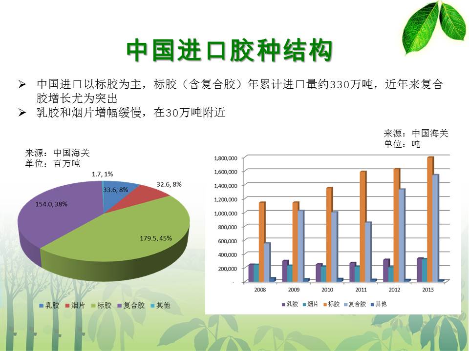 中国进口以标胶为主,标胶(含复合胶)年累计进口量约330万吨,近年来复合胶增长尤为突出