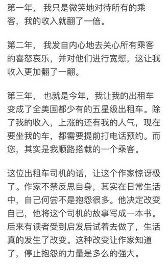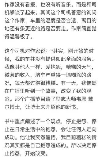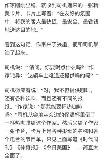 有一个作家出差时,无意中坐了一辆非常有特色的出租车。这辆出租车的司机穿着干净,车里也非常干净。