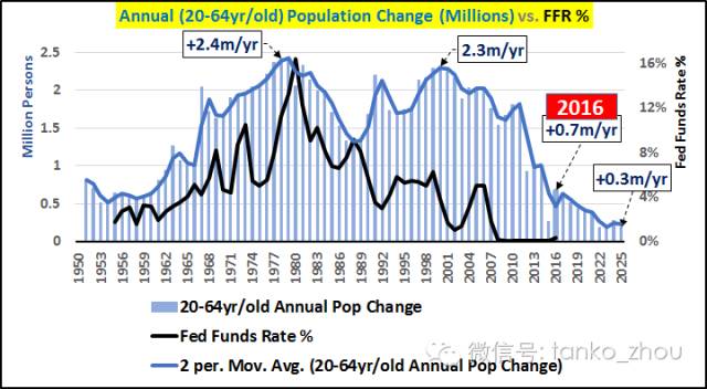 图:1950年至2025年,美国20-64岁成年人人口年变化(蓝色)和联邦基金利率(黑色)走势对比图。