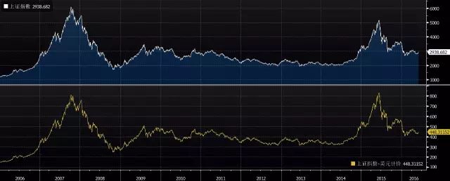 黄线是美元计价的上证指数
